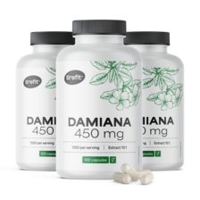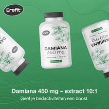 Ingrediënten: extract van stengels en bladeren van damiana 10:1 (Turnera diffusa), inuline, hydroxypropylmethylcellulose (HPMC; plantaardige capsuleomhulling), L-leucine.